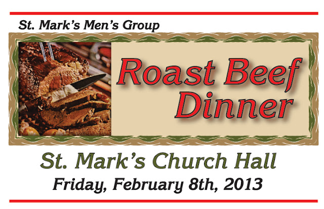 St. Mark’s Men’s Group Roast Beef Dinner at St. Mark’s Church Hall on Friday, February 8th, 2013 from 4:30 to 6:00 p.m. Eat in or Take out. Tickets at the door. Adults $12.00/Children $6.00
